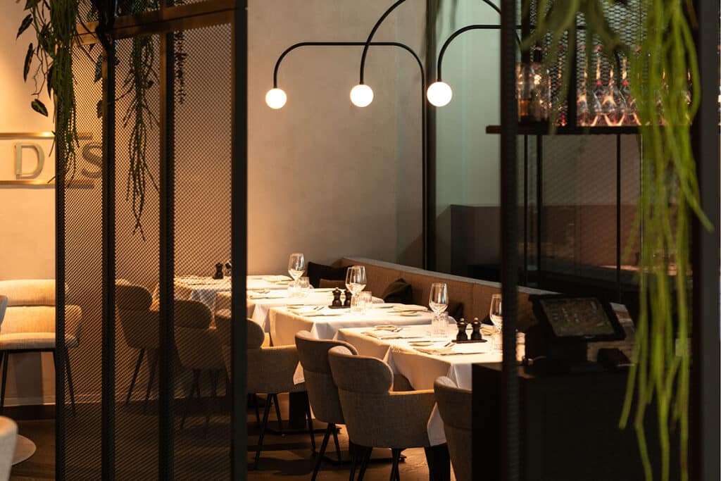 Geen parket dat na drie jaar wegslijt door zand, geen wastafels die beschadigen door verkeerde poetsmiddelen, geen ruimtes die akoestisch zo hard zijn dat gasten er niet willen blijven. Ook back-of-house wordt integraal meegenomen: keukenstromen, bediening, ergonomie, zichtbaarheid van pass-throughs, onderhoudsroutes ,… Want een ruimte werkt alleen als ze voor iedereen werkt, niet alleen voor de gast.